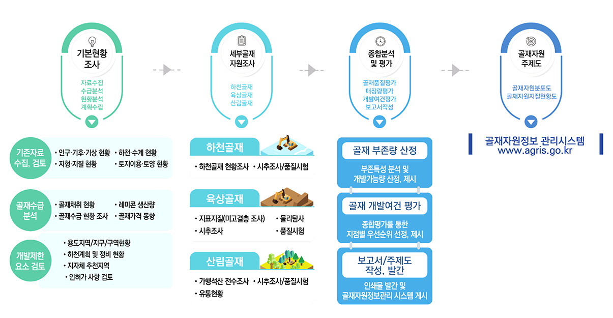 「골재채취법 시행령」 제3조 제1항에 의거, 국토교통부장관은 매년도별로 전국의 골재자원에 대한 지역별ㆍ종류별 조사계획을 수립하고 이에 따라 골재자원조사를 실시하여야 합니다.